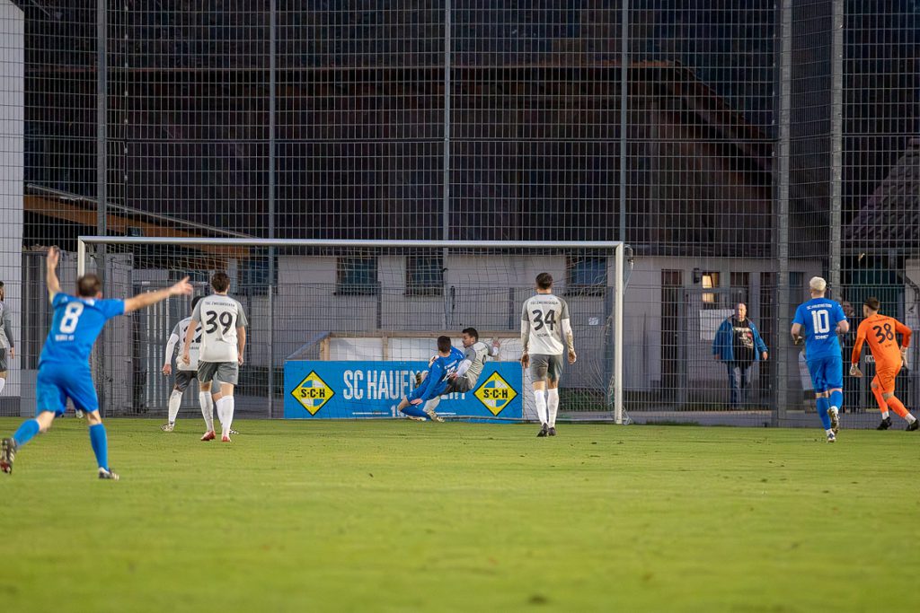 Dem TSC Zweibrücken war das Selbstbewusstsein nach zuletzt sieben Punkten aus drei Spielen anzumerken. Von Beginn an drückten die Gäste den überraschten Tabellenführer in die eigene Hälfte. Es dauerte rund zehn Minuten, bis sich die Hauensteiner auf das frühe Pressing etwas besser eingestellt hatten. Kurz darauf hatte Riggers (10.) nach einem Freistoß durch Veith die erste große Chance auf die Hauensteiner Führung. Doch Schmidt im TSC Tor reagierte stark und klärte zur Ecke. Drei Minuten später hatte die Heimelf Glück, als Schehl den aufs Tor zu laufenden Seasy knapp vor der Strafraumgrenze foulte.